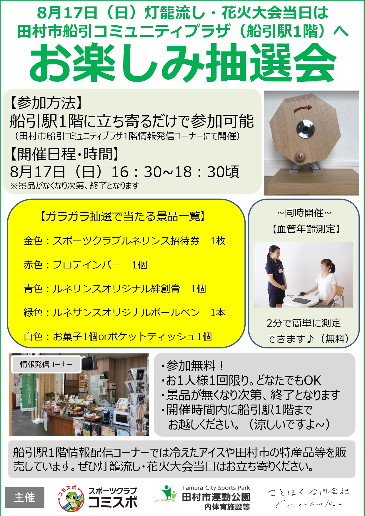 今週末に開催される灯籠流しと花火大会に「お楽しみ抽選会・血管年齢測定」